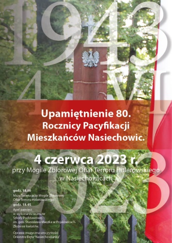 Burmistrz Gminy i Miasta Miechów Dariusz Marczewski oraz Rada Sołecka Nasiechowic serdecznie zapraszają na uroczystość Upamiętnienia 80. Rocznicy Pacyfikacji Mieszkańców Nasiechowic, która odbędzie się 4 czerwca br.