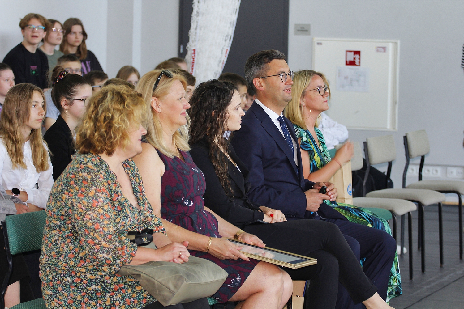 W spotkaniu wzięli udział - Pełnomocnik Ministra Edukacji i Nauki ds. Transformacji Cyfrowej Justyna Orłowska, Burmistrz Gminy i Miasta Miechów Dariusz Marczewski, Dyrektor Szkoły Podstawowej im. Generała Stanisława Maczka w Pojałowicach Beata Kluza, Dyrektor Szkoły Podstawowej Nr 1 im. Marii Konopnickiej w Miechowie oraz dyrektorzy pozostałych placówek z terenu powiatu.