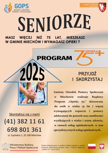 Program „Opieka 75+” - na rok 2025 Gminny Ośrodek Pomocy Społecznej w Miechowie realizuje program Ministerstwa Rodziny, Pracy i Polityki Społecznej „Opieka... -