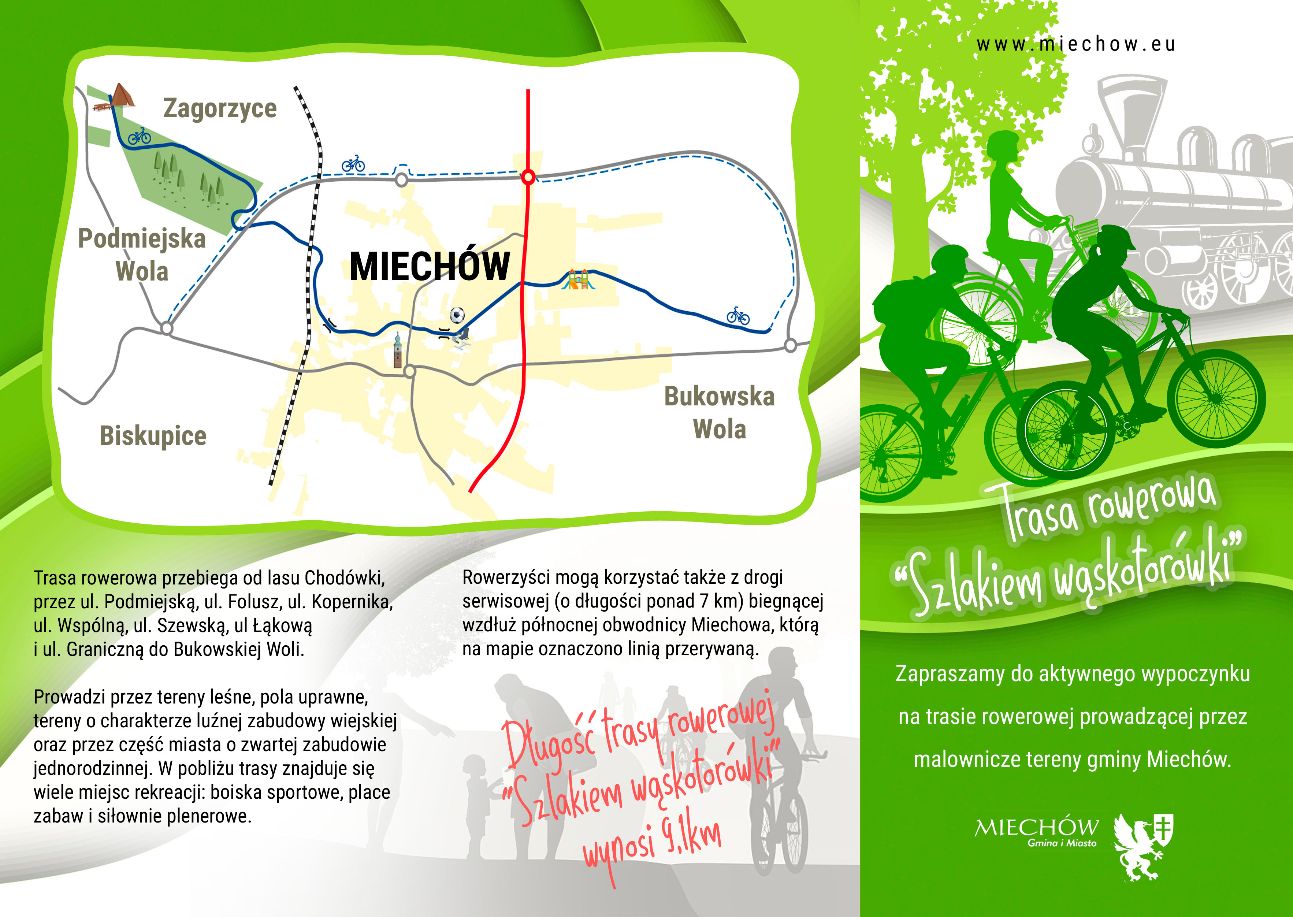 Trasa: Miechów: Rynek, ul. H. Sienkiewicza, ul. Krótka, ul. Kolejowa – Komorów (3 km) – Kamieńczyce (4 km) – Jaksice (5 km) – Przesławice (7 km) – Czaple Wielkie (11 km) – Czaple Małe (14,5 km) – Wysocice (18 km) – Ulina Mała (22,5 km) – Ulina Wielka (23,5 km) – Zawadka (26 km) – Mostek (28 km) – Trzebienice (30,5 km) – Szreniawa (32,5 km) – Przybysławice (34 km) – Maków (36,5 km) – Wielkanoc (40 km) – Gołcza (41 km) – Rzeżuśnia (43 km) – Krępa (46 km) – Biskupice (49 km) – Miechów: ul. Kraszewskiego, ul. H. Sienkiewicza, Rynek (53 km)