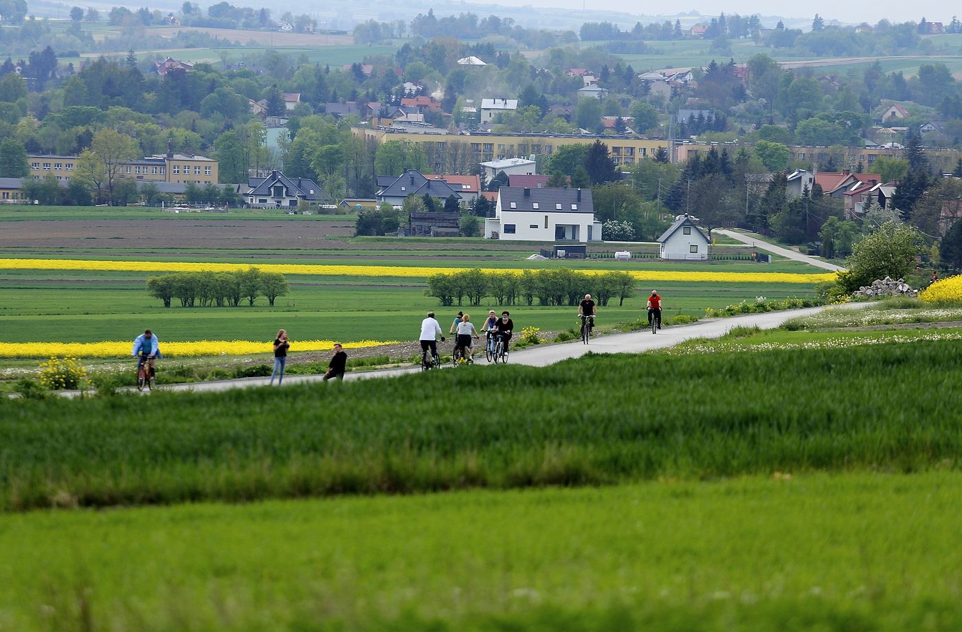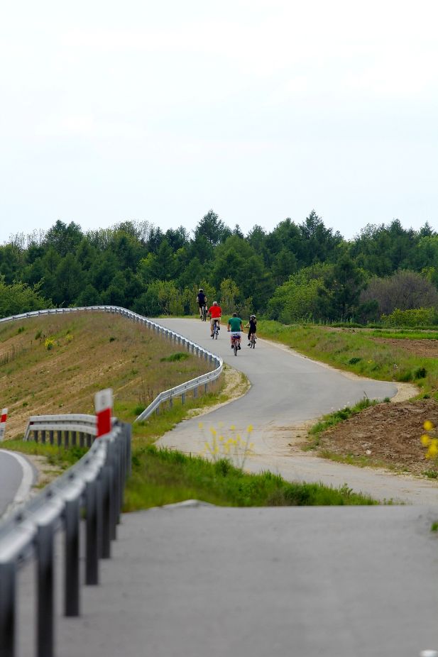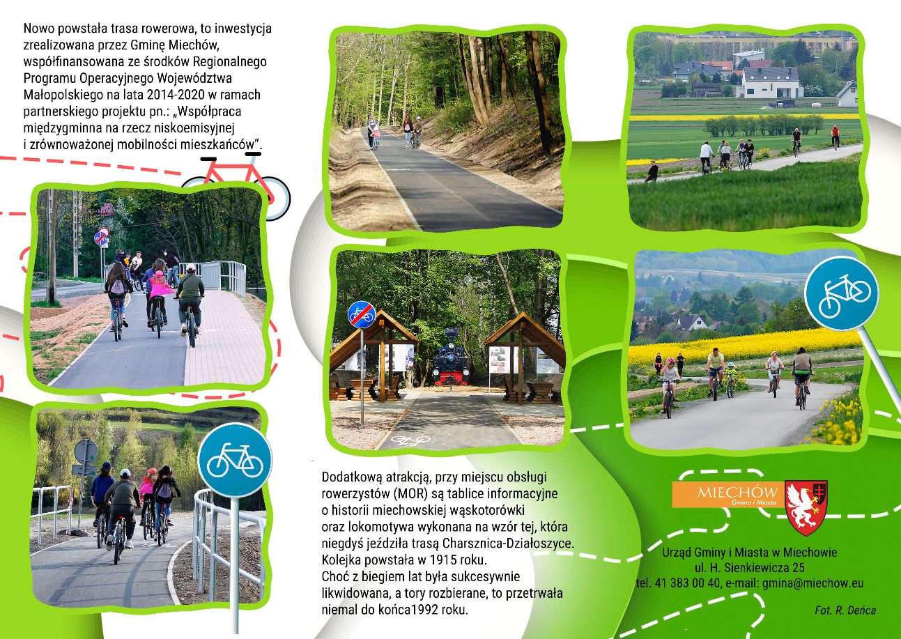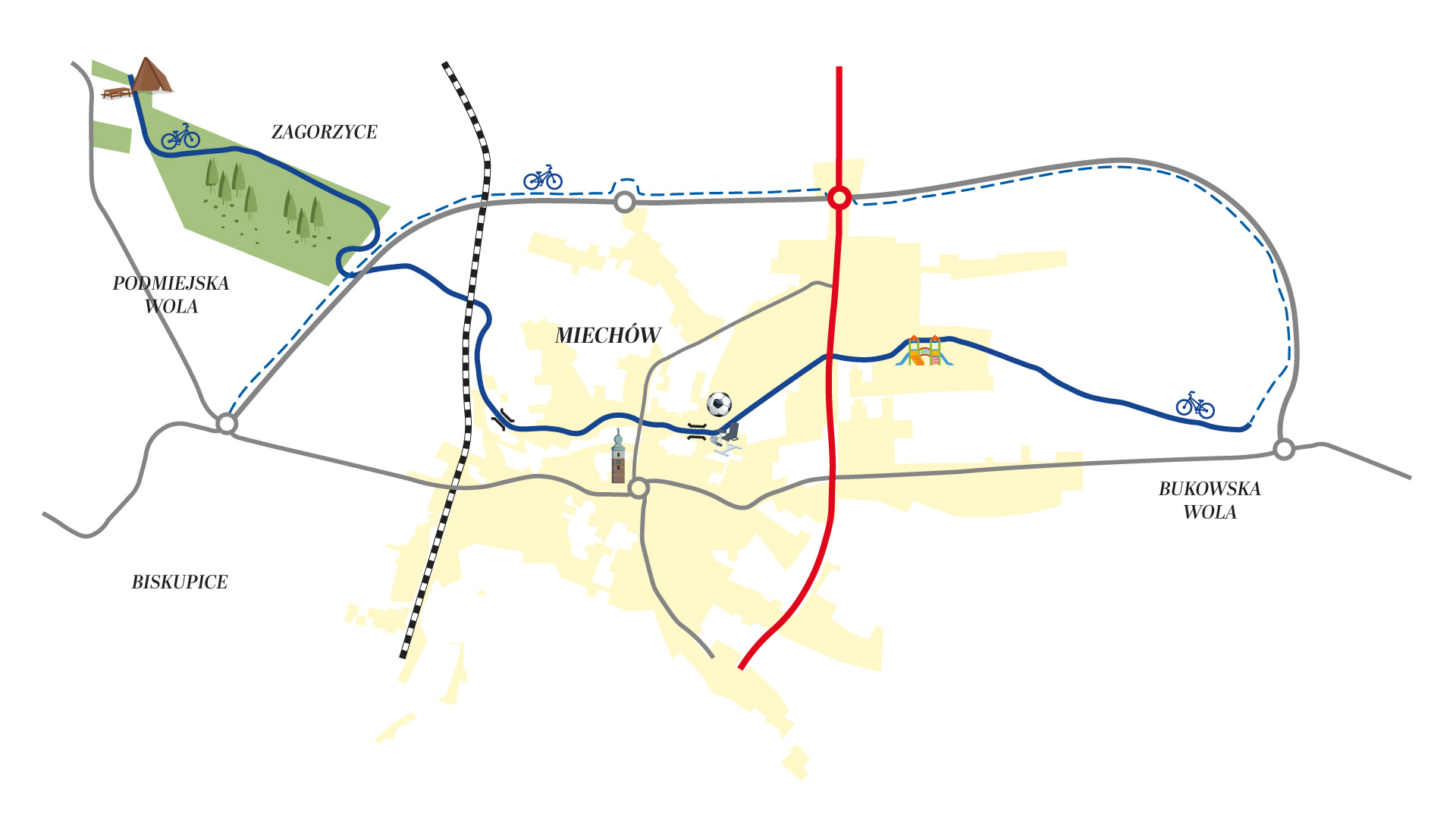 Wycieczkę rozpoczynamy w Miechowie na Rynku. Zwiedzamy Bazylikę Grobu Bożego oraz zabudowania poklasztorne. W następnej kolejności jedziemy ulicą Warszawską, skręcamy w ulicę Partyzantów. Na skrzyżowaniu ulic znajduje się obelisk z przełomu 1939/45. Docieramy do Siedlisk, zwiedzamy kościół pw. Świętego Krzyża, a następnie zmieniamy kurs i jedziemy w kierunku zachodnim. Na 7 km trasy opuszczamy gminę Miechów. W tym miejscu znajduje się pomnik ofiar masowych straceń w Chodówkach. To doskonałe miejsce na zejście z rowerów i odpoczynek. Dalszy etap trasy prowadzi przez Chodów: kościół św. Jana Chrzciciela do Charsznicy. Charsznica określana jest mianem „kapuścianej stolicy Polski”. Na szczególną uwagę zasługuje dworzec kolejowy, zakłady Malatyńskiego oraz kościół pw. Matki Bożej Różańcowej. Na wysokości kościoła skręcamy w prawo i jedziemy w kierunku Uniejowa – Kolonii. Dojeżdżamy do wiaduktu kolejowego. Przed wiaduktem skręcamy w lewo. Jedziemy wzdłuż linii kolejowej.Po przeciwnej stronie linii kolejowej znajduje się mogiła ofiar katastrofy kolejowej. To kolejne miejsce na odpoczynek.Po krótkiej przerwie wsiadamy na rowery i jedziemy w dalszą podróż. Mijamy Charsznicę – Wieś i docieramy do Tczycy. Zwiedzamy grodzisko rycerskie oraz neogotycki kościół św. Idziego. Wyjeżdżamy z Tczycy. W odległości 1,5 km za wsią po prawej stronie drogi jest zlokalizowany sztuczny zalew wodny. Dalsza trasa wiedzie nas przez miejscowości: Pogwizdów i Uniejów – Rędziny. Docieramy do Tunelu, w tym miejscu znajduje się najdłuższy w Polsce tunel kolejowy. W dalszej kolejności jedziemy przez kompleks leśny, w którym zlokalizowane jest najwyższe wzniesienie Wyżyny Miechowskiej – Biała Góra (414 m n.p.m.) oraz rezerwaty przyrody: „Biała Góra” i „Kępie”. Trasa wymaga większego wysiłku, prowadzi drogami o zróżnicowanym urozmaiceniu rzeźby terenu. Opuszczamy kompleks leśny. Początkowo jedziemy wzdłuż linii kolejowej, potem zmieniamy kierunek jazdy i przejeżdżamy przez dwa odcinki linii kolejowej. Pierwszy z nich – nieczynny, znajduje się tuż przy lesie, kolejny odcinek to linia kolejowa LHS (Linia Hutnicza Szerokotorowa). Przejeżdżamy przez miejscowość Przysieka i docieramy do Kozłowa. Zwiedzamy kościół Podwyższenia Krzyża Świętego. W tym miejscu znajduje się punkt końcowy trasy rowerowej.